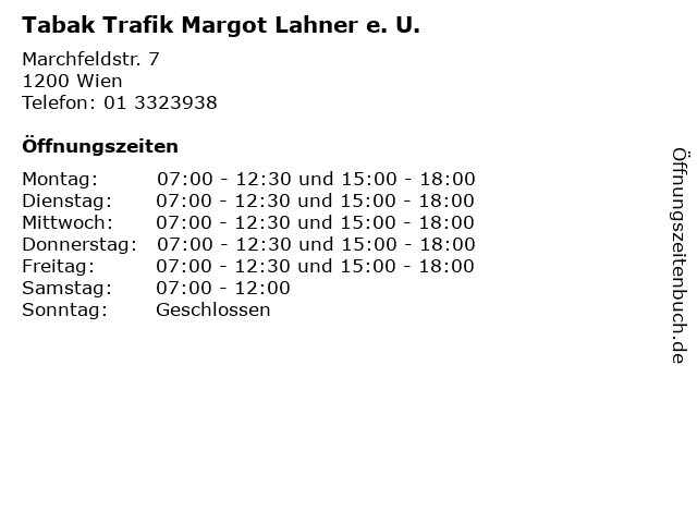 | Öffnungszeiten Tabak Trafik Margot Lahner e. U. in Wien anzeigen | |