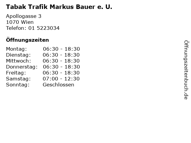 | Öffnungszeiten Tabak Trafik Markus Bauer e. U. in Wien anzeigen | |