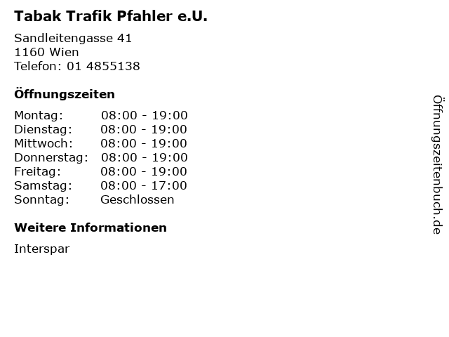 | Öffnungszeiten Tabak Trafik Pfahler e.U. in Wien anzeigen | |