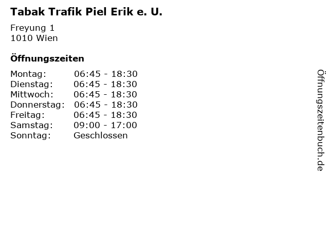 | Öffnungszeiten Tabak Trafik Piel Erik e. U. in Wien anzeigen | |