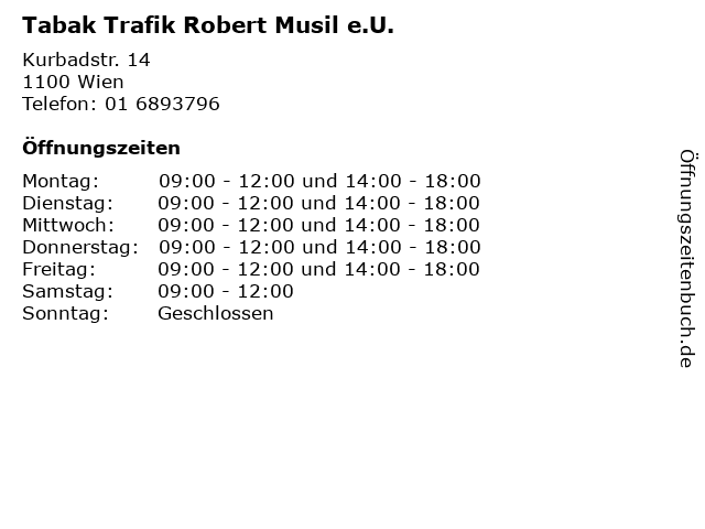 | Öffnungszeiten Tabak Trafik Robert Musil e.U. in Wien anzeigen | |