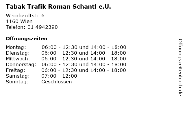 | Öffnungszeiten Tabak Trafik Roman Schantl e.U. in Wien anzeigen | |