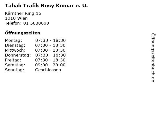 | Öffnungszeiten Tabak Trafik Rosy Kumar e. U. in Wien anzeigen | |
