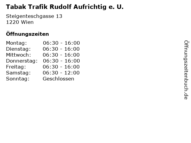 | Öffnungszeiten Tabak Trafik Rudolf Aufrichtig e. U. in Wien anzeigen | |
