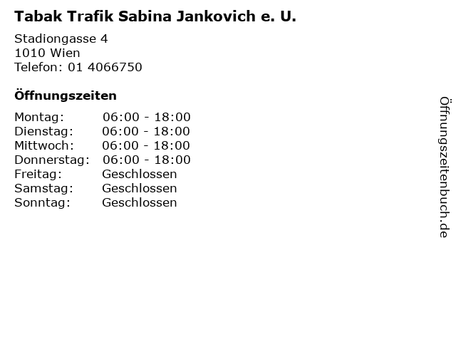 Branchen & Suchbegriffe zu Tabak Trafik Sabina Jankovich e. U.:e., jankovich, magazine, sabina, tabak, tabakwaren, trafik, u., zeitungen |
