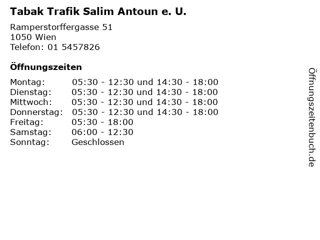 | Öffnungszeiten Tabak Trafik Salim Antoun e. U. in Wien anzeigen | |