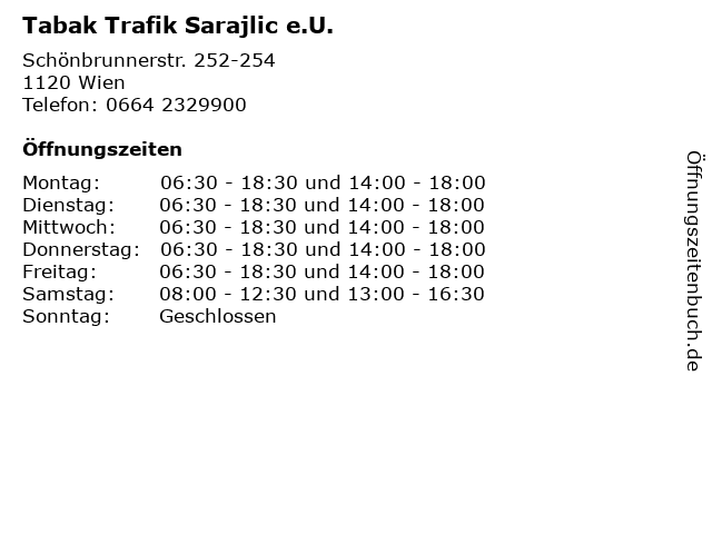 | Öffnungszeiten Tabak Trafik Sarajlic e.U. in Wien anzeigen | |