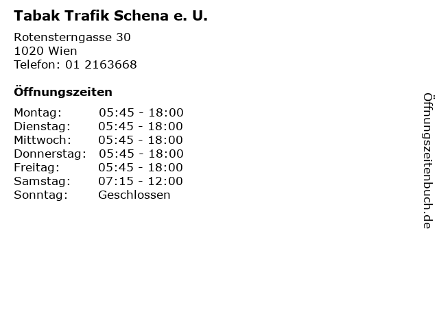 | Öffnungszeiten Tabak Trafik Schena e. U. in Wien anzeigen | |