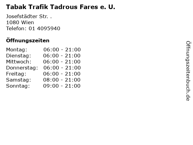 | Öffnungszeiten Tabak Trafik Tadrous Fares e. U. in Wien anzeigen | |