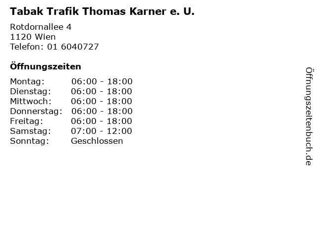 | Öffnungszeiten Tabak Trafik Thomas Karner e. U. in Wien anzeigen | |