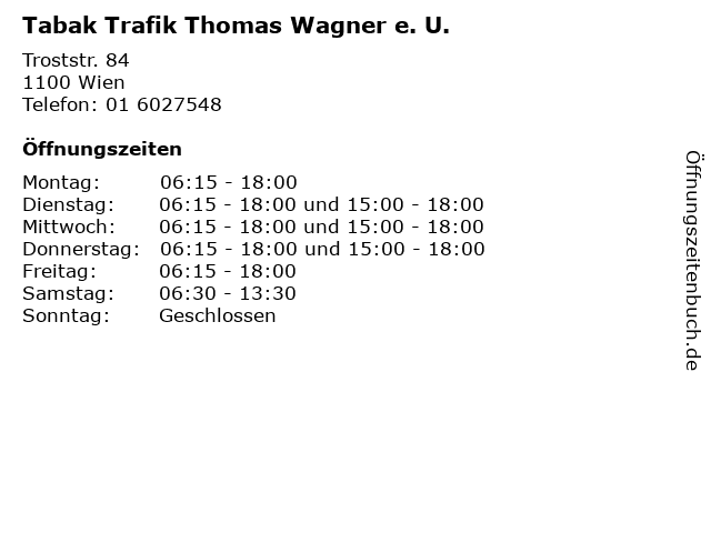 | Öffnungszeiten Tabak Trafik Thomas Wagner e. U. in Wien anzeigen | |