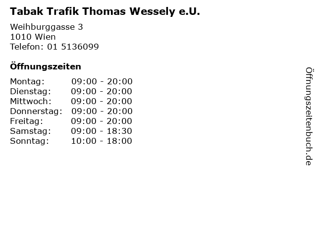| Öffnungszeiten Tabak Trafik Thomas Wessely e.U. in Wien anzeigen | |
