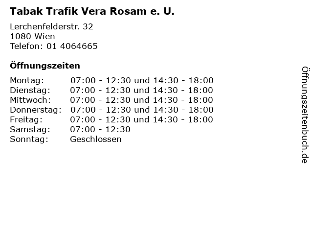 | Öffnungszeiten Tabak Trafik Vera Rosam e. U. in Wien anzeigen | |