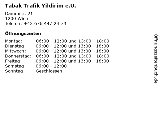 | Öffnungszeiten Tabak Trafik Yildirim e.U. in Wien anzeigen | |