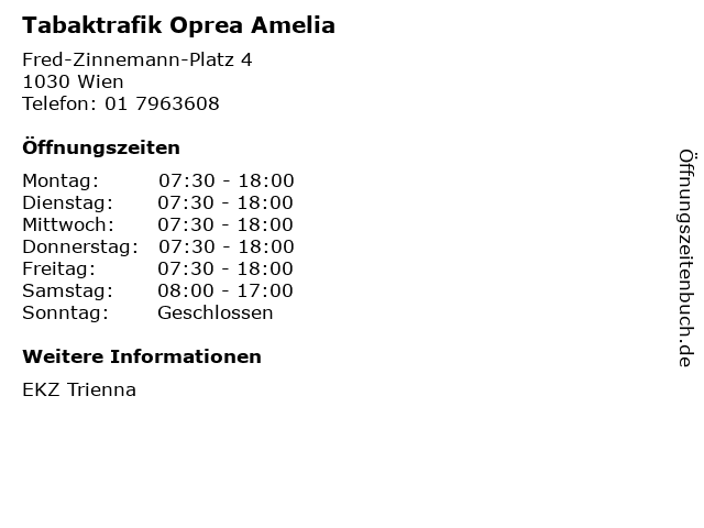| Öffnungszeiten Tabaktrafik Oprea Amelia in Wien anzeigen | |