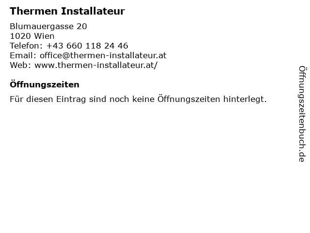 | Öffnungszeiten Thermen Installateur in Wien anzeigen | |