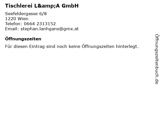 | Öffnungszeiten Tischlerei L&A GmbH in Wien anzeigen | |