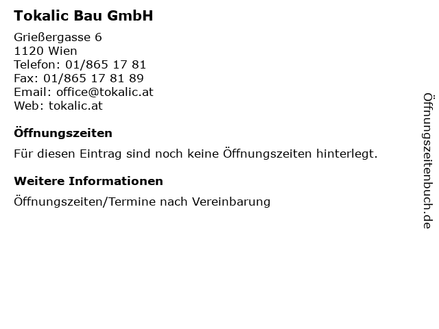 | Öffnungszeiten Tokalic Bau GmbH in Wien anzeigen | |