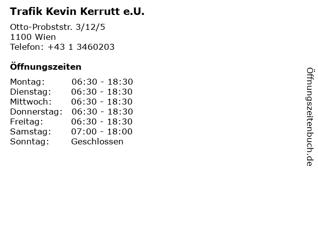 | Öffnungszeiten Trafik Kevin Kerrutt e.U. in Wien anzeigen | |