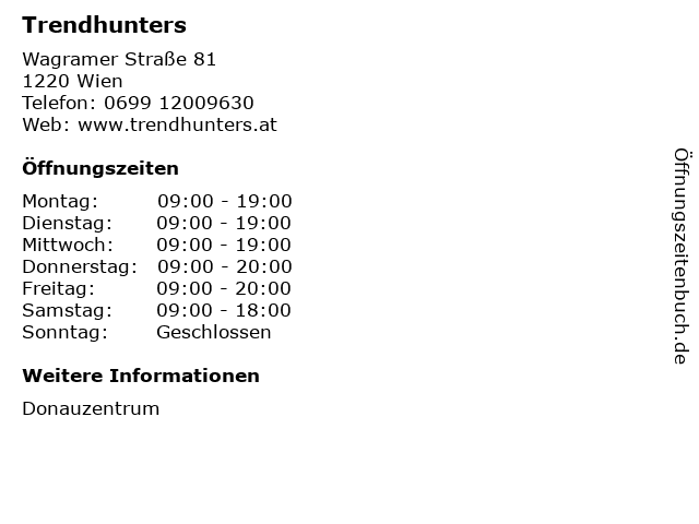 | Öffnungszeiten Trendhunters in Wien anzeigen | |