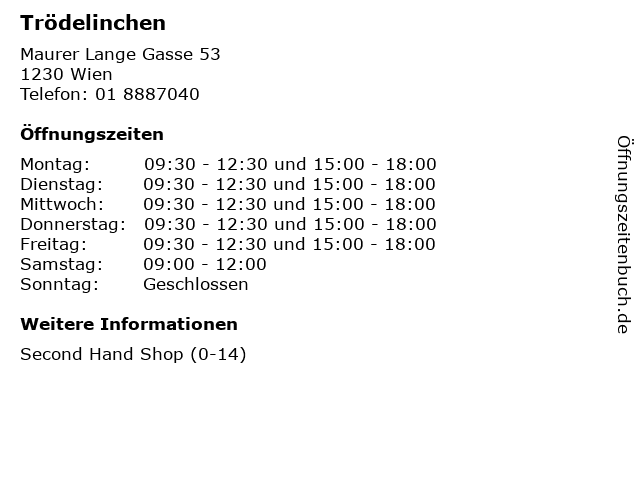 | Öffnungszeiten Trödelinchen in Wien anzeigen | |