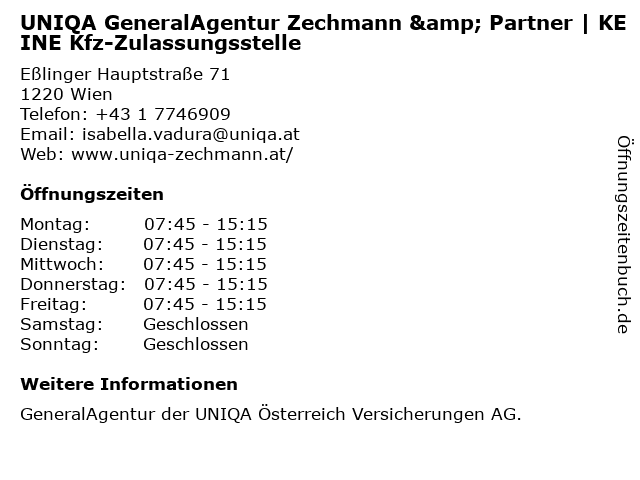 2 UNIQA GeneralAgentur Larcher Peter & Kfz Zulassungsstelle (Entfernung: 2,51 km) Kirchenplatz 8-9, 2301 Groß-Enzersdorf 3 UNIQA Versicherungen - GeneralAgentur Larcher Peter (Beratung & Service) (Entfernung: 2,52 km) Kirchenplatz 8-9/1/1A, 2301 Groß-Enzersdorf 6 |
