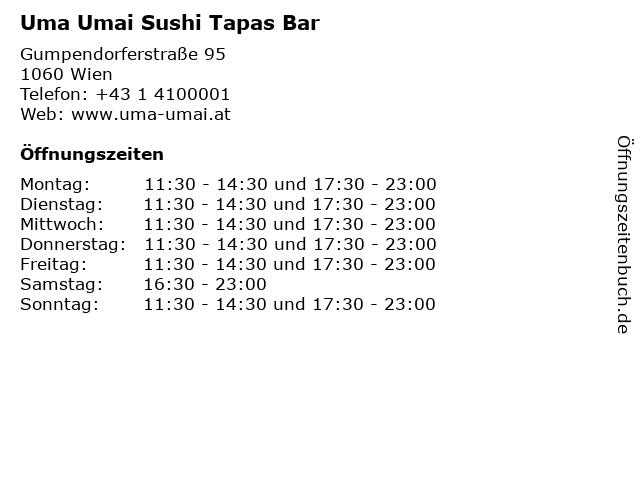 | Öffnungszeiten Uma Umai Sushi Tapas Bar in Wien anzeigen | |