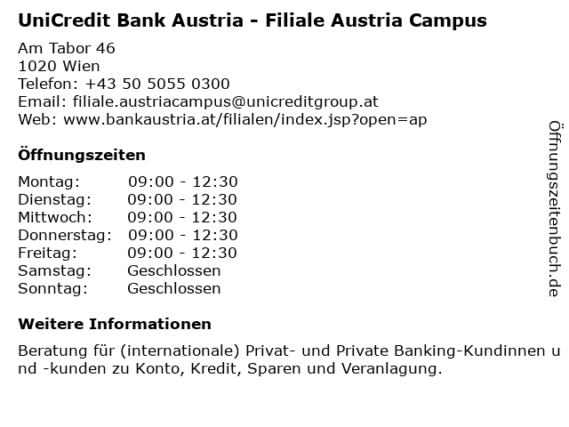Branchen & Suchbegriffe zu UniCredit Bank Austria - Filiale Austria Campus:austria, bank, campus, privat- und private banking-kundinnen und -kunden, unicredit |