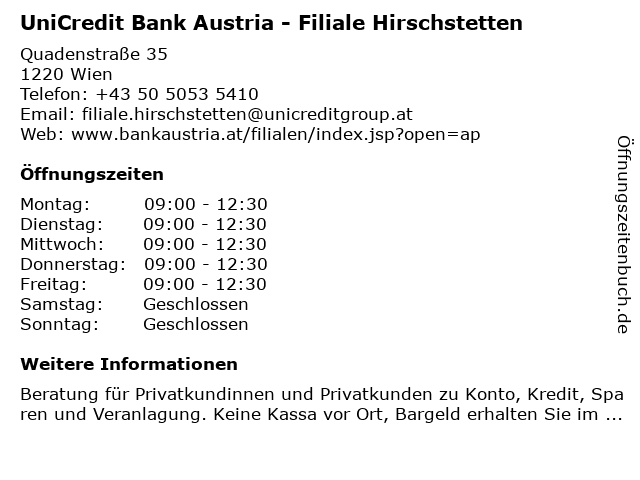 Branchen & Suchbegriffe zu UniCredit Bank Austria - Filiale Hirschstetten:austria, bank, hirschstetten, privatkundinnen und privatkunden, unicredit |