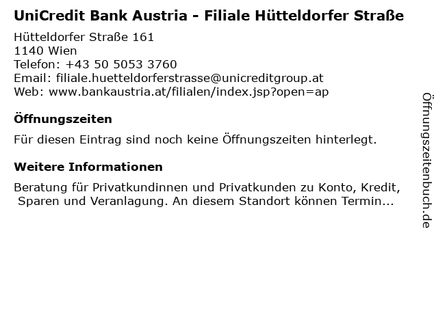 | UniCredit Bank Austria - Filiale Hütteldorfer Straße anrufen | |