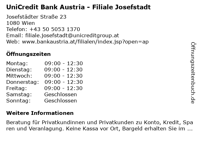 Branchen & Suchbegriffe zu UniCredit Bank Austria - Filiale Josefstadt:austria, bank, josefstadt, privatkundinnen und privatkunden, unicredit |