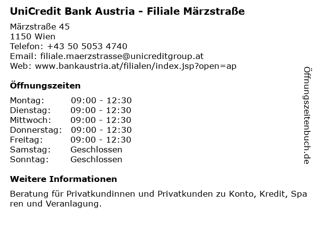 Branchen & Suchbegriffe zu UniCredit Bank Austria - Filiale Märzstraße:austria, bank, märzstraße, privatkundinnen und privatkunden, unicredit |