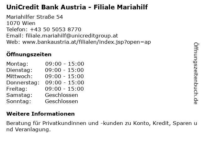 Branchen & Suchbegriffe zu UniCredit Bank Austria - Filiale Mariahilf:austria, bank, mariahilf, privatkundinnen und -kunden, unicredit |