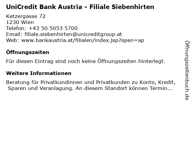 | UniCredit Bank Austria - Filiale Siebenhirten anrufen | |