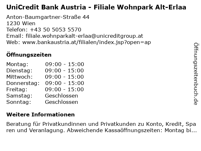 Branchen & Suchbegriffe zu UniCredit Bank Austria - Filiale Wohnpark Alt-Erlaa:alt, austria, bank, erlaa, privatkundinnen und privatkunden, unicredit, wohnpark |