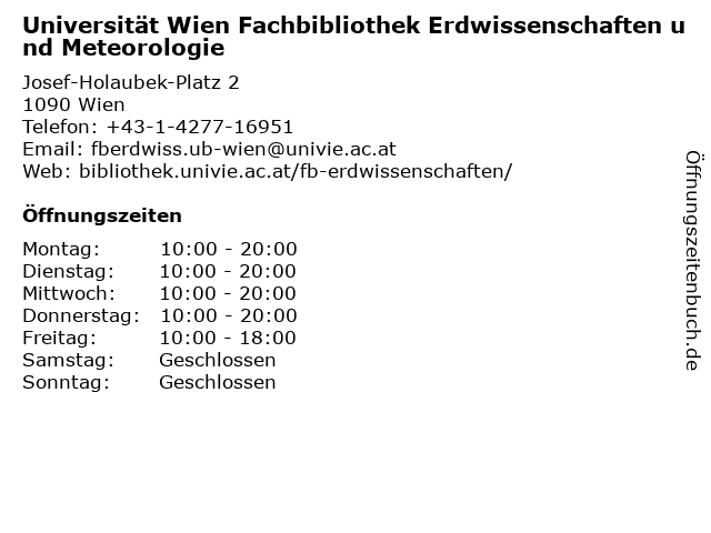 1 Universität Wien Fachbibliothek Pharmazie und Ernährungswissenschaften (Entfernung: 0,00 km) Josef-Holaubek-Platz 2, 1090 Wien 2 Universität Wien Fachbibliothek Theater-, Film- und Medienwissenschaft (Entfernung: 0,00 km) Josef-Holaubek-Platz 2, 1090 Wien 3 Universität Wien - Erdwissenschaften und Meteorologie (Entfernung: 0,08 km) Althanstraße 14, 1010 Wien 4 Universität Wien - Afrikawissenschaften und Orientalistik (Entfernung: 1,72 km) Spitalgasse 2-4, 1010 Wien 6 Universität Wien - Fachbibliothek Chemie und Astronomie (Standort Astronomie) (Entfernung: 1,88 km) Türkenschanzstraße 17, 1180 Wien |