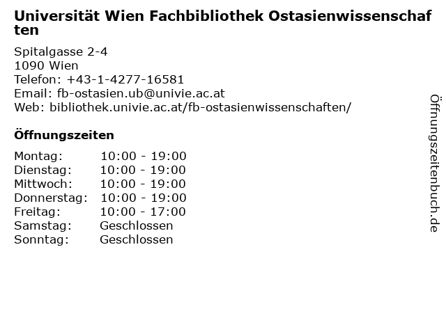 1 Fachbibliothek Kunstgeschichte Campus der Universität Wien (Entfernung: 0,00 km) Spitalgasse 2-4, 1010 Wien 3 Universität Wien Fachbibliothek Osteuropäische Geschichte und Slawistik (Entfernung: 0,00 km) Spitalgasse 2-4, 1090 Wien 5 Universität Wien Fachbibliothek Südasien-, Tibet- und Buddhismuskunde (Entfernung: 0,00 km) Spitalgasse 2-4, 1090 Wien 6 |