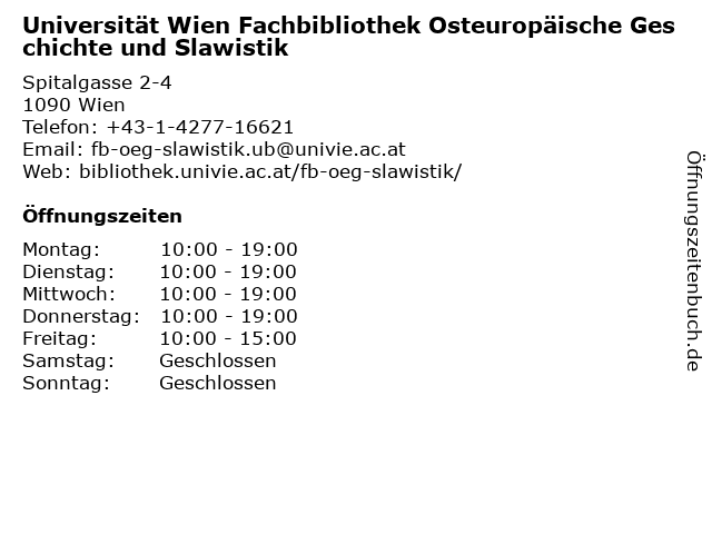 Branchen & Suchbegriffe zu Universität Wien Fachbibliothek Osteuropäische Geschichte und Slawistik:bibliothek, buch, buchscanner, fachbibliothek, geschichte, literaturen, osteuropäische, slawistik, sprachen, universität, wien |
