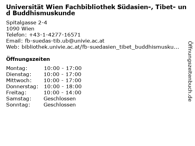 1 Fachbibliothek Kunstgeschichte Campus der Universität Wien (Entfernung: 0,00 km) Spitalgasse 2-4, 1010 Wien 3 Universität Wien Fachbibliothek Osteuropäische Geschichte und Slawistik (Entfernung: 0,00 km) Spitalgasse 2-4, 1090 Wien 4 Universität Wien Fachbibliothek Ostasienwissenschaften (Entfernung: 0,00 km) Spitalgasse 2-4, 1090 Wien 6 |
