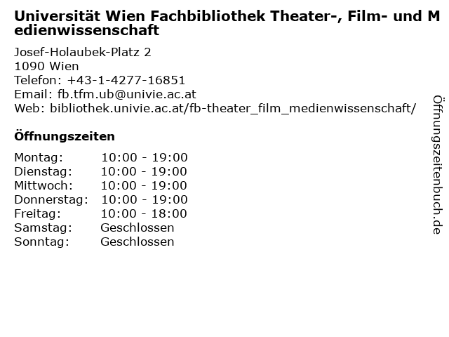 Branchen & Suchbegriffe zu Universität Wien Fachbibliothek Theater-, Film- und Medienwissenschaft:bibliothek, buch, buchscanner, fachbibliothek, film, literaturen, medienwissenschaft, sprachen, theater, universität, wien |