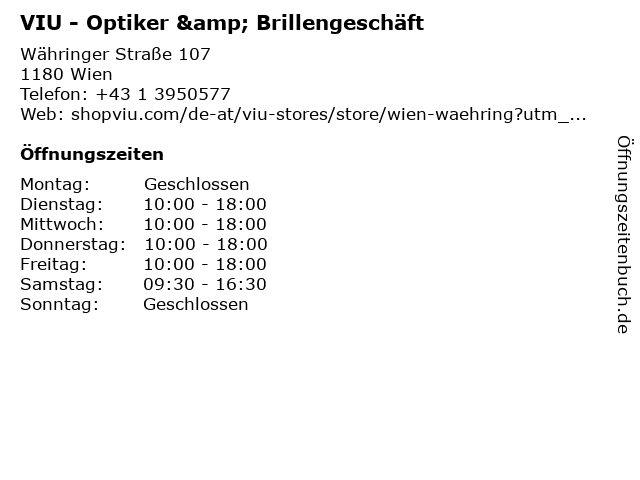 | Öffnungszeiten VIU - Optiker & Brillengeschäft in Wien anzeigen | |
