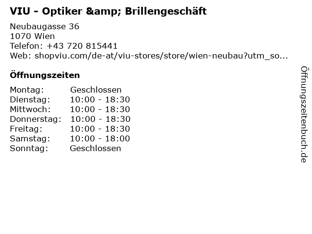 | Öffnungszeiten VIU - Optiker & Brillengeschäft in Wien anzeigen | |