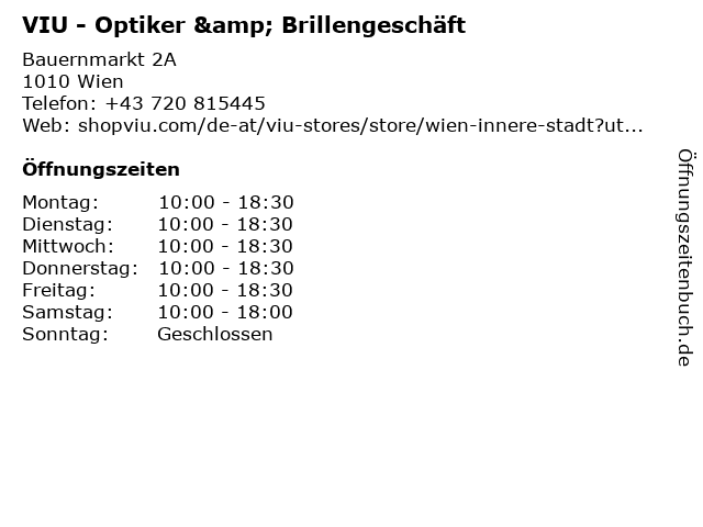 | Öffnungszeiten VIU - Optiker & Brillengeschäft in Wien anzeigen | |