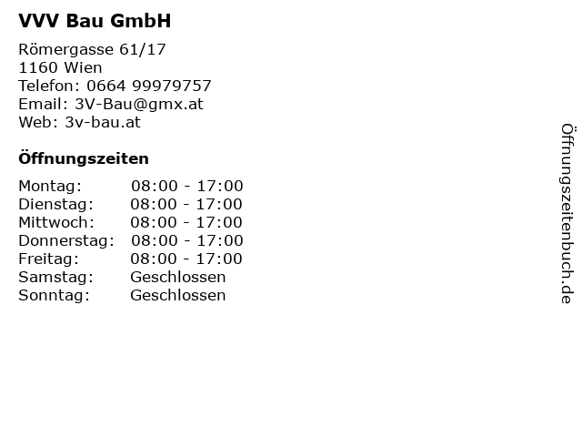 | Öffnungszeiten VVV Bau GmbH in Wien anzeigen | |