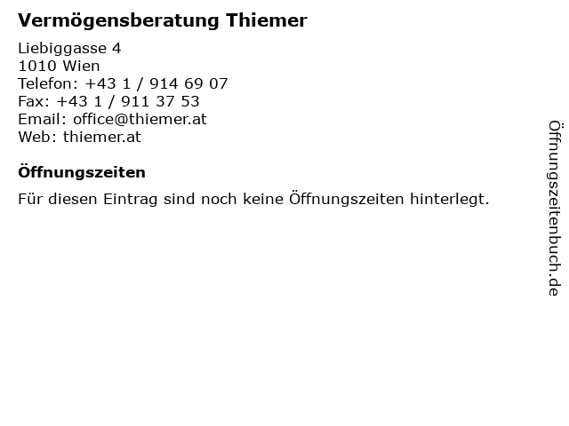 | Öffnungszeiten Vermögensberatung Thiemer in Wien anzeigen | |