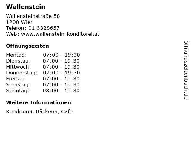 | Öffnungszeiten Wallenstein in Wien anzeigen | |
