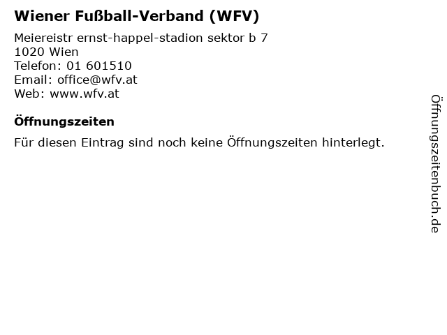 | Öffnungszeiten Wiener Fußball-Verband (WFV) in Wien anzeigen | |
