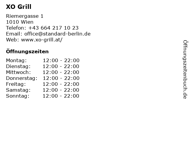 | Öffnungszeiten XO Grill in Wien anzeigen | |