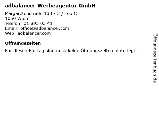 | Öffnungszeiten adbalancer Werbeagentur GmbH in Wien anzeigen | |