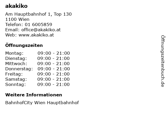 | Öffnungszeiten akakiko in Wien anzeigen | |